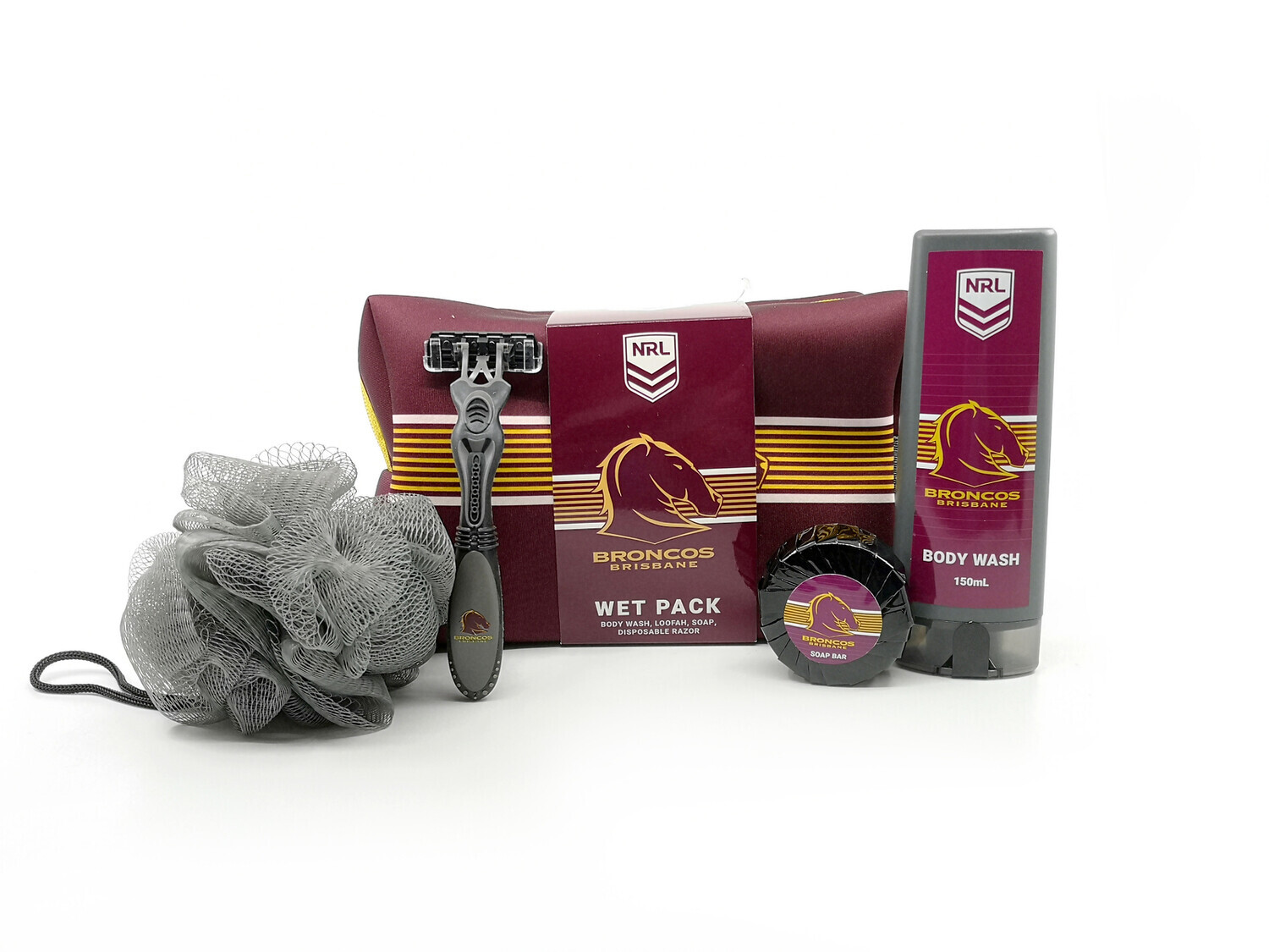 NRL Wet Pack Gift Set Brisbane Broncos Wet packs in a zipped neoprene bag, contain: 150ml Body Wash (team branded); Disposable Razor (team branded); 50 grm Soap (team branded); Loofa;