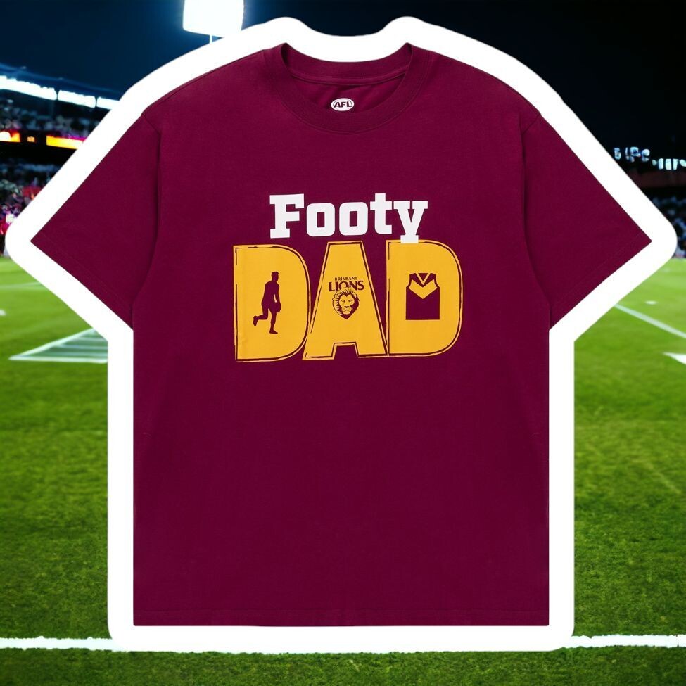 Celebrate the footy-loving hero in your life with the perfect gift: the Brisbane Lions Men's "Footy Dad" Tee. Crafted with both comfort and style in mind, this tee is the ultimate way for Dad to show off his love for the game and his fatherly pride.