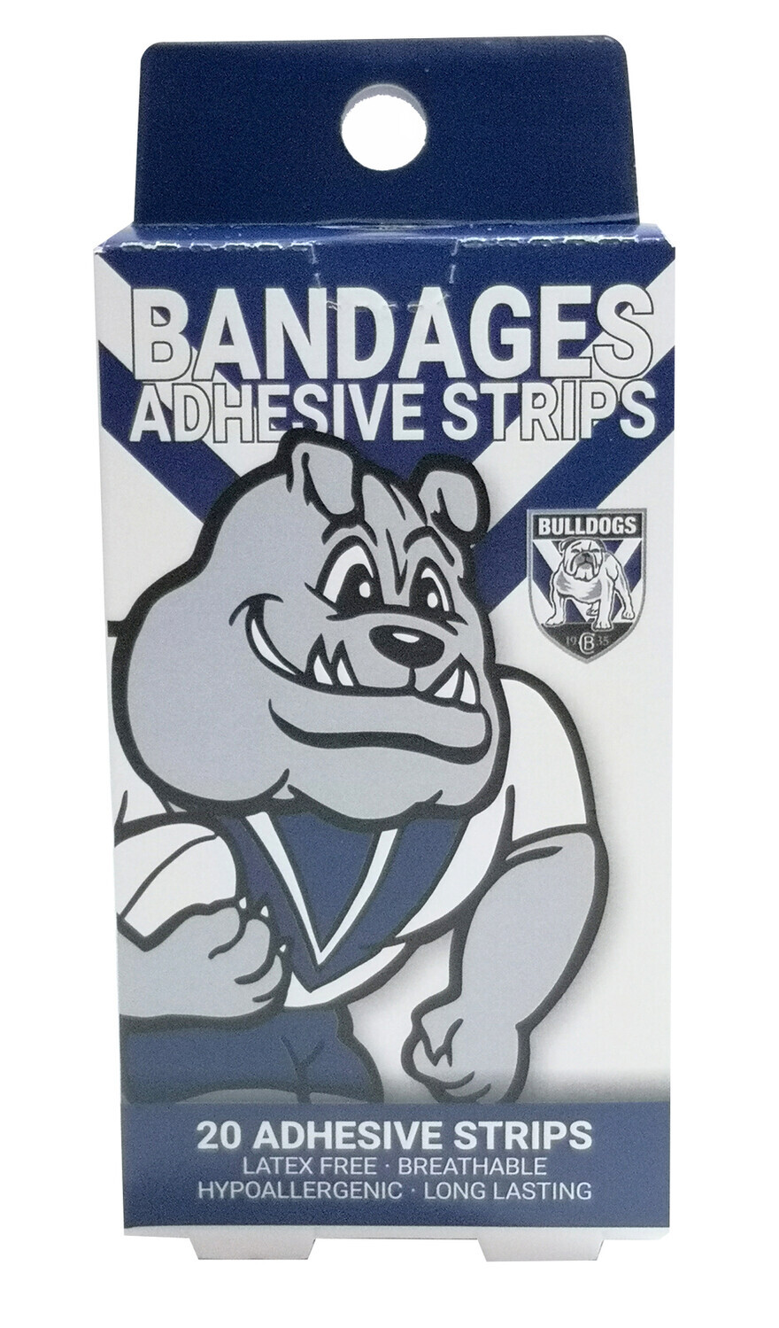 Official NRL Merchandise Canterbury-Bankstown Bulldogs NRL Mascot Bandages; Premium Quality Adhesive strips. Latex Free, Breathable, Hypoallergenic and Long Lasting. 20 Per Package including 2 Different Designs! Suitable for Adults and Children