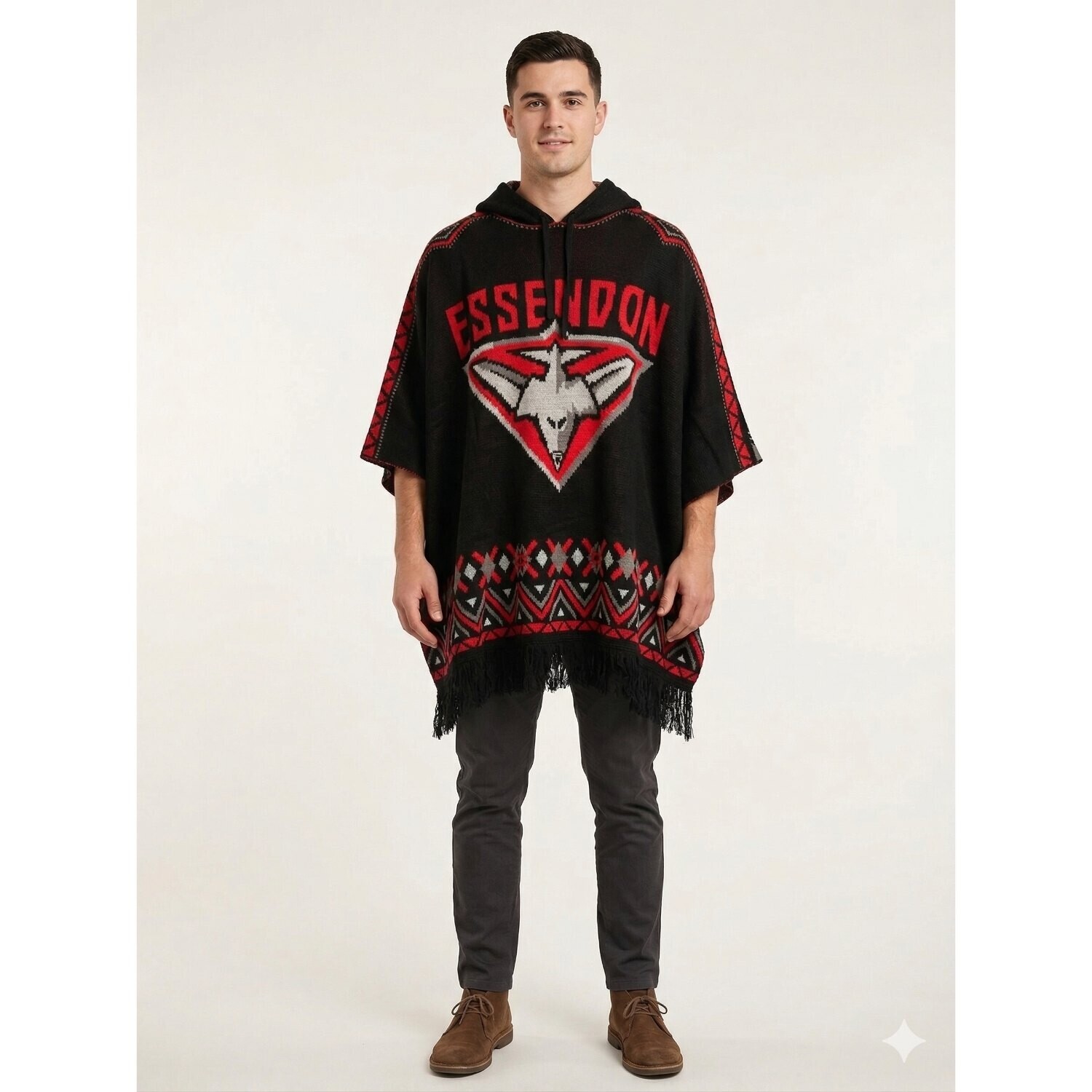 Make a bold statement in the grandstands while staying toasty warm with the Essendon Bombers Dakota Knitted Poncho. This heavy duty winter accessory brings a fresh, stylish twist to traditional footy merchandise. Showcasing an eye catching Inca-inspired pattern woven directly into the bold team colours, it ensures your club pride is always the centre of attention.