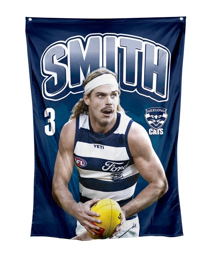 Take your supporter style to the next level with the Geelong Cats Bailey Smith Wall Flag. Designed with bold team colours and a dynamic player image, this flag instantly transforms any space into a true fan zone.