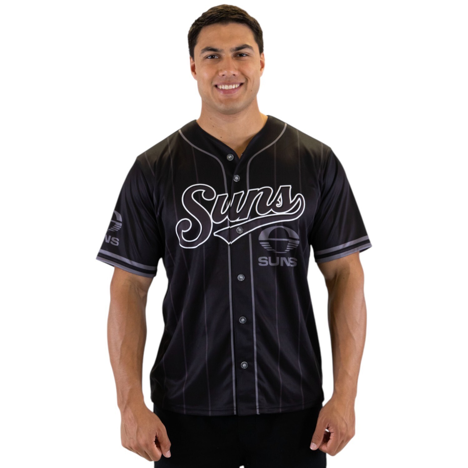Make a statement on and off the field with the Gold Coast Suns Blackout Baseball Shirt. Designed with bold pinstripe detailing and a sleek all black aesthetic, this shirt delivers classic baseball styling with strong club presence.
