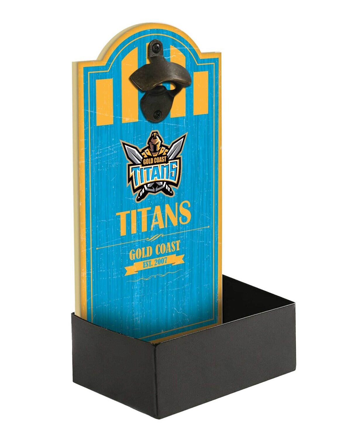 Official NRL Merchandise Gold Coast Titans NRL MDF Bottle Opener with Catcher; - Team branded sign - Includes metal bottle opener and cap catcher - Total size: H35cm x 10.5cm x 16.5cm - Official NRL Merchandise - Inner 2, Outer 8