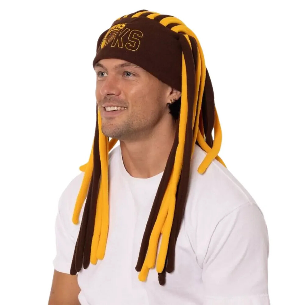 Turn up the volume on game day with the Hawthorn Hawks Supporter Dreadlock Beanie - the ultimate headwear for fans who love to stand out. Bold, fun and packed with club pride, this beanie brings serious energy whether you're in the stands, at a watch party, or leading the chant from home.