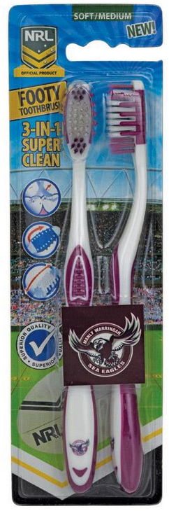Official NRL Merchandise Manly Warringah Sea Eagles NRL Adults Toothbrush - 2 Pack; Keep your teeth clean with the Official NRL Toothbrush - 2 Pack. Excellent Quality - Superior Construction! Recommended and used by The National Rugby League and Australian Dentists. Suitable for Adults and Children Age 6+3 in 1 Cleaning System: TEETH, TONGUE & GUMS. Dentists Recommend replacing your toothbrush every 3 months. Support Your Club Every Morning & Every Night!