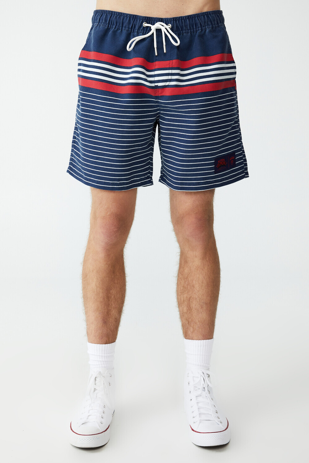 Upgrade your summer wardrobe with these Melbourne Demons men?s board shorts, combining team pride with everyday functionality. Designed in a classic navy colour with eye-catching red and white stripes, these shorts are perfect for both active and casual lifestyles.