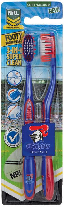 Official NRL Merchandise Newcastle Knights NRL Adults Toothbrush - 2 Pack; Keep your teeth clean with the Official NRL Toothbrush - 2 Pack. Excellent Quality - Superior Construction! Recommended and used by The National Rugby League and Australian Dentists. Suitable for Adults and Children Age 6+3 in 1 Cleaning System: TEETH, TONGUE & GUMS. Dentists Recommend replacing your toothbrush every 3 months. Support Your Club Every Morning & Every Night!