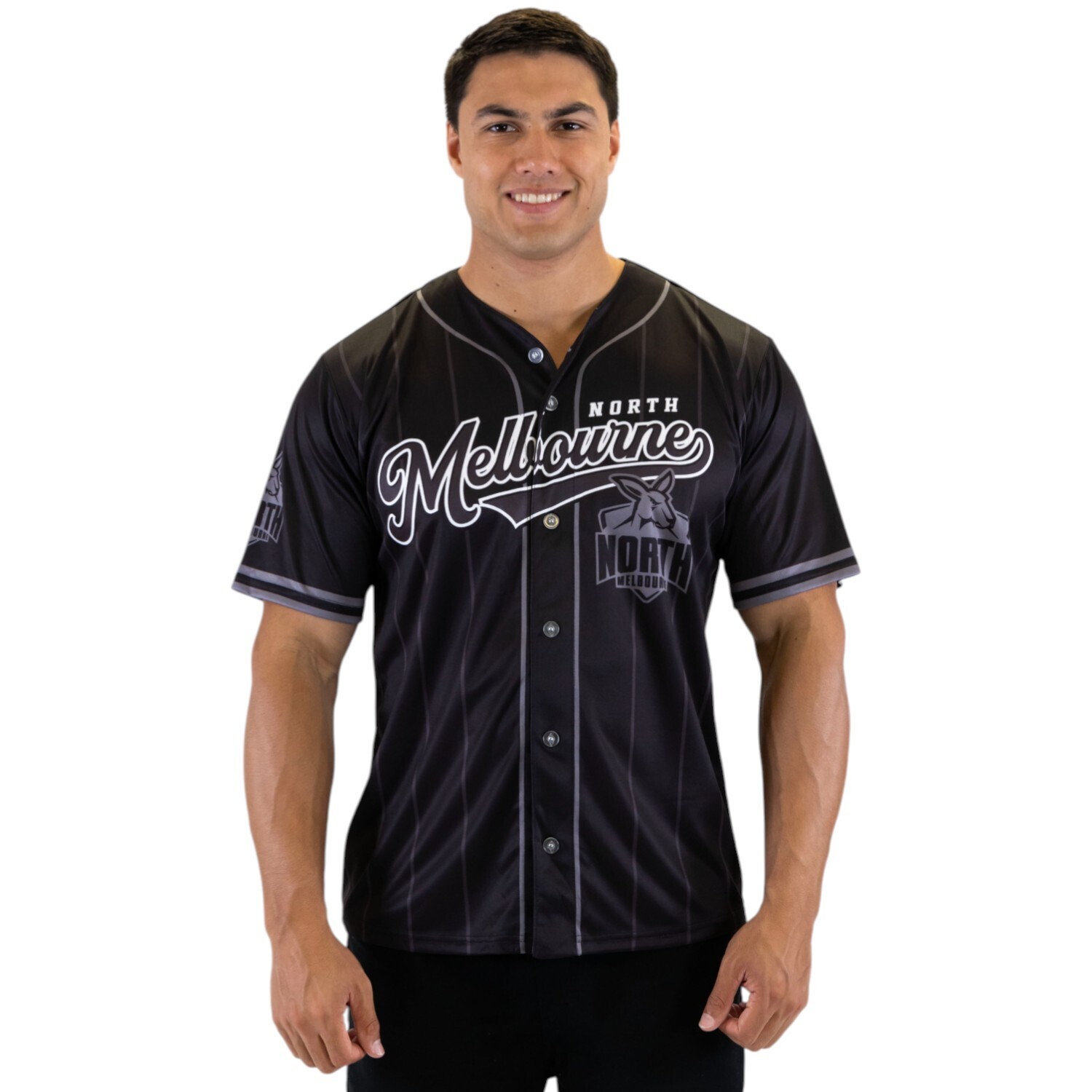 Make a statement on and off the field with the North Melbourne Kangaroos Blackout Baseball Shirt. Designed with bold pinstripe detailing and a sleek all black aesthetic, this shirt delivers classic baseball styling with strong club presence.