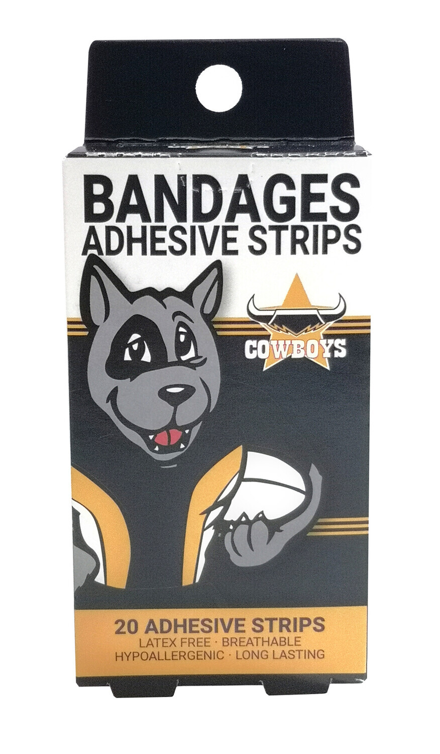 Official NRL Merchandise North Queensland Cowboys NRL Mascot Bandages; Premium Quality Adhesive strips. Latex Free, Breathable, Hypoallergenic and Long Lasting. 20 Per Package including 2 Different Designs! Suitable for Adults and Children