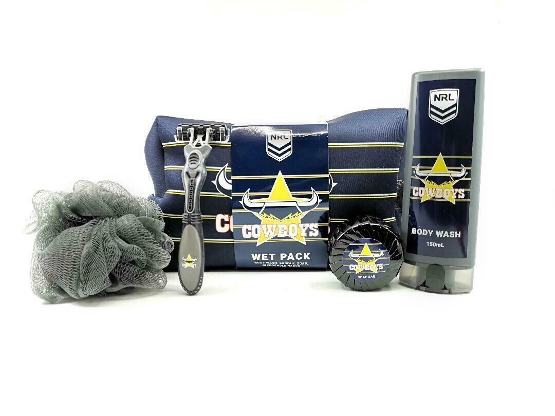 NRL Wet Pack Gift Set North Queensland Cowboys Wet packs in a zipped neoprene bag, contain: 150ml Body Wash (team branded); Disposable Razor (team branded); 50 grm Soap (team branded); Loofa;