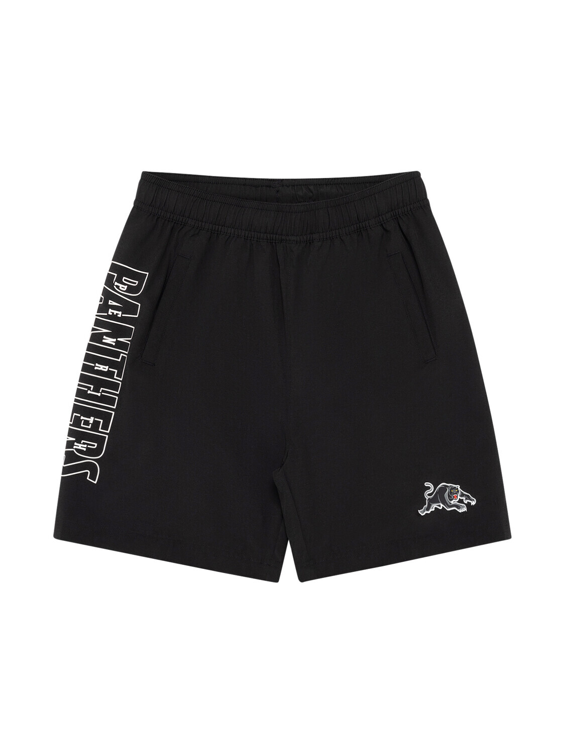 Official NRL Penrith Panthers NRL Mens Performance Short :135GMS 92/8 Poly Elastane 4 Way Stretch, Side Soft Plastisol Wordmark Print, Front Soft Plastisol Logo Print, Black.