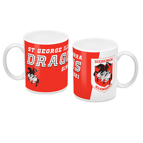 Official NRL St George Illawarra Dragons Logo Mug. The mug consists of the St George Illawarra Dragons club logo on the front and team specific visual on the back. Material: Ceramic Product name: Official NRL St George Illawarra Dragons Logo Mug NRL Team: St George Illawarra Dragons Return to the St George Illawarra Dragons NRL store online