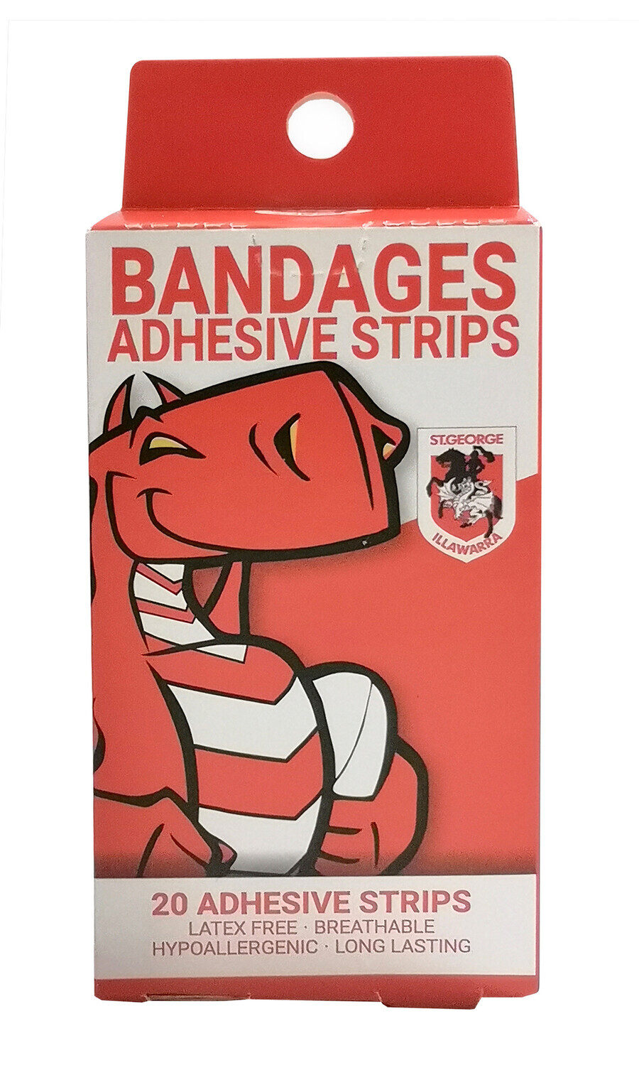Official NRL Merchandise St George Illawarra Dragons NRL Mascot Bandages; Premium Quality Adhesive strips. Latex Free, Breathable, Hypoallergenic and Long Lasting. 20 Per Package including 2 Different Designs! Suitable for Adults and Children