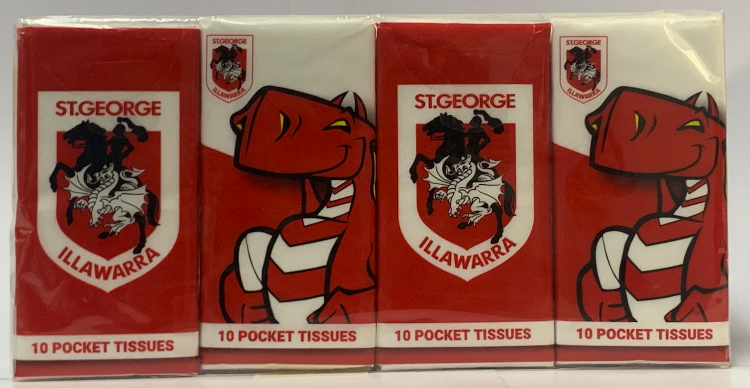 Official NRL Merchandise St George Illawarra Dragons NRL Mascot Pocket Tissues - 4 Pack; Pure White Pocket Tissues - 6 Pack - 10 3 PLY Large Tissues 20x20cm. Excellent Quality - Soft and Supple! Support Your Club Every Day!