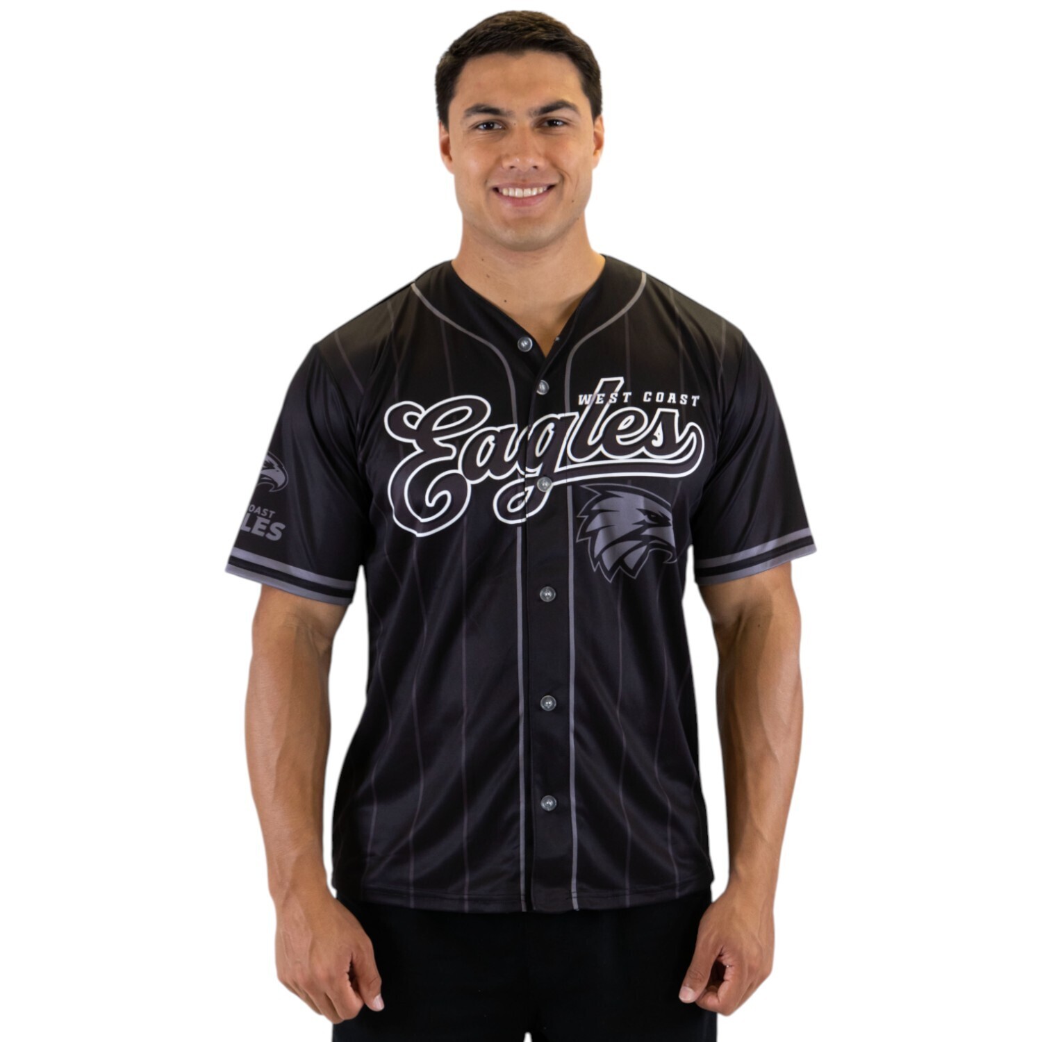 Make a statement on and off the field with the West Coast Eagles Blackout Baseball Shirt. Designed with bold pinstripe detailing and a sleek all black aesthetic, this shirt delivers classic baseball styling with strong club presence.