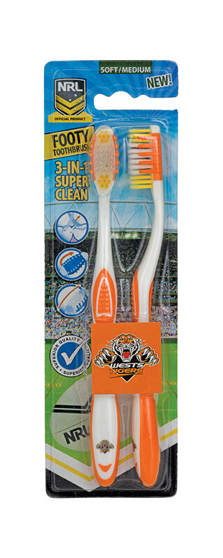 Official NRL Merchandise West Tigers NRL Adults Toothbrush - 2 Pack; Keep your teeth clean with the Official NRL Toothbrush - 2 Pack. Excellent Quality - Superior Construction! Recommended and used by The National Rugby League and Australian Dentists. Suitable for Adults and Children Age 6+3 in 1 Cleaning System: TEETH, TONGUE & GUMS. Dentists Recommend replacing your toothbrush every 3 months. Support Your Club Every Morning & Every Night!
