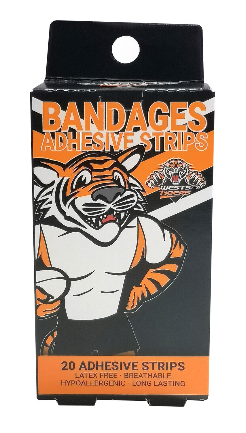 Official NRL Merchandise West Tigers NRL Mascot Bandages; Premium Quality Adhesive strips. Latex Free, Breathable, Hypoallergenic and Long Lasting. 20 Per Package including 2 Different Designs! Suitable for Adults and Children