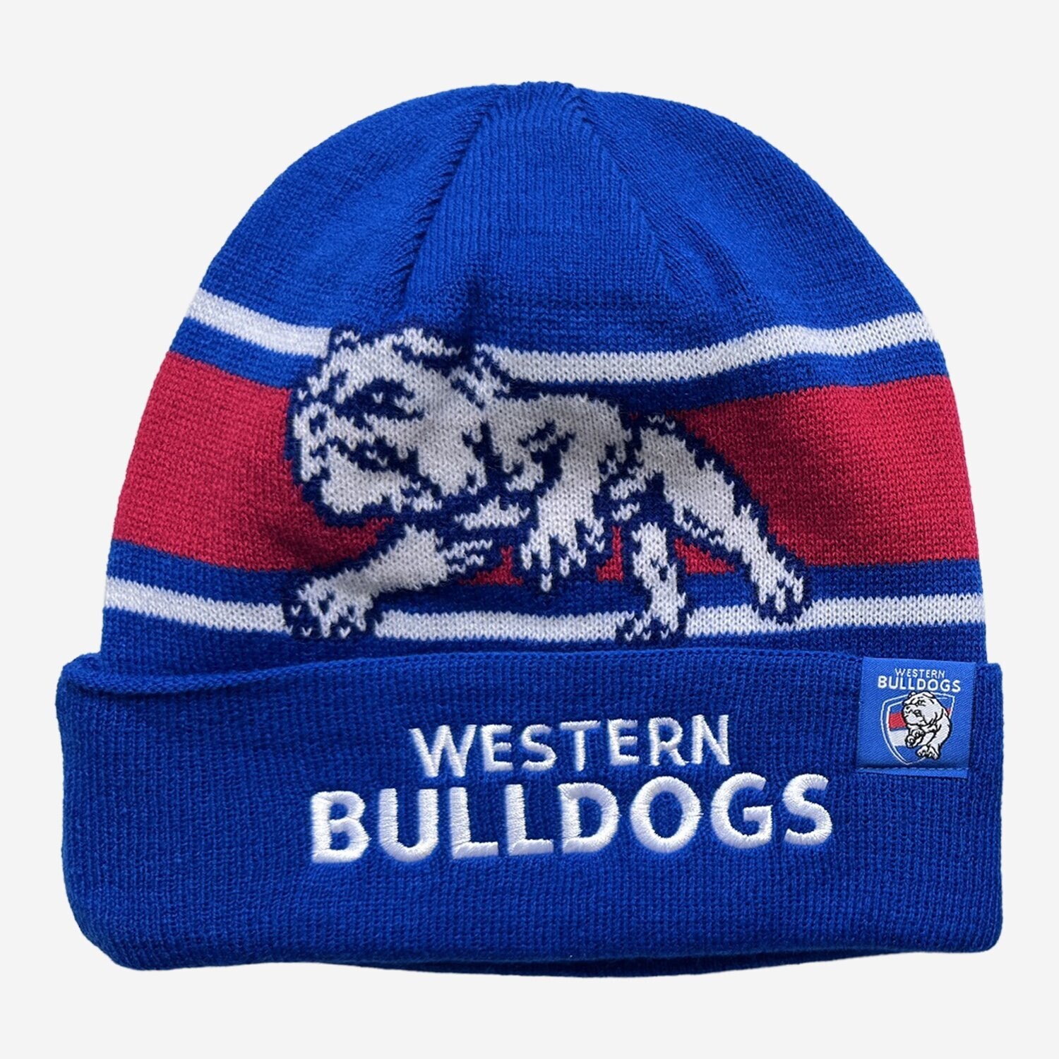 Switch up your game day style instantly with the reversible Western Bulldogs Transform Beanie. This versatile knit beanie is designed for fans who love options. Wear it loud and proud with the bold jacquard knit side, featuring vibrant club colours, a secondary logo on the crown, and team word-mark embroidery on the cuff.