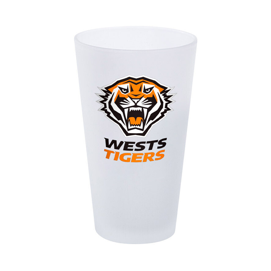 Official NRL Merchandise Wests Tigers NRL Frosted Glass; - Conical glass - NRL logo design - 450ml capacity - Barcode sticker only - Official NRL merchandise